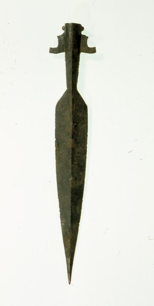 Everyone’s favorite weapon, of course, the one that gets all the press, is the sword. Swords of our period seem mainly to have been modeled on the roman cavalry sword, the spatha. Long, straight, and double edged, swords in this form were designed for slashing, and required a fair amount of room to use. The gladius, the short sword of the legions, had fallen out of favor during the third century, as it was adapted primarily to close-order fighting, and the tight legionary formations had become obsolete as the Romans turned their attention to more mobile cavalry armies. The early-medieval evolution of the spatha combined it with Germanic patterns through distinct stages, passing through swords of the migration period, to those made by Merovingian smiths in the eighth century, to culminate in what is usually called a “Viking” sword. More properly it should be called the Carolingian pattern, as the shape was well established in the Frankish empire by the time the Norse adopted it and made it their own. Straight with a mostly rounded tip, these blades were all primarily slashing weapons. Early versions were smooth-bladed, but as time went on smiths incorporated fullers in the blade to reduce weight and improve strength. Grips were generally short, in the neighborhood of four inches, so single-hand use only. The cross guard was one of the innovations from the spatha, and were usually straight in the earlier part of our period, though a fashion for curved guards would develop in Britain and Scandinavia later on. Pommels show the most variation between periods and places. Earliest swords commonly sport flattened pyramid-like pommels, later to be joined by simple discs, the brazil nut oblong shape, and the three or five lobes of the classic “viking sword”. The giving and receiving of swords was a highly significant ritual, and a special class of early swords, called ring-swords, give historians something to puzzle about. These particular swords have holes in their pommels with a ring passed through them, they are usually high quality, but they are found in multiple contexts and cultures, and their significance remains uncertain.