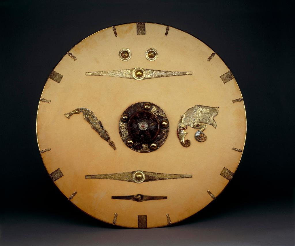 So much for offense, what about defense? Shields were almost universally round, sometimes oval, and made of wood. At the center of the circle would be a hole, with a grip placed across it, then covered with a metal dome called a boss. The shield bosses in most of our time period were conical in shape, many with a peened rod or button projecting at the center, designed to catch enemy weapons, it also could be used to punch. In spite of what you may have in mind, most shields were not edged in iron banding, though they may have been bound with leather. Shields were brightly painted, but ultimately disposable, the shattering of shields, or the gradual whittling down of them in long flights is a common theme in descriptions of battles.