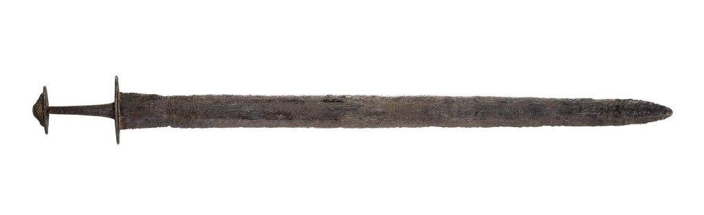 While we’re discussing themes that will get me in trouble with people in trench coats, let’s move on to axes. Because surely if we imagine the warrior of the dark ages, we imagine the bearded Viking with his battle ax. The good news is that yes, the Vikings were enthusiastic users of the battle ax. The bad news is that we won’t be talking about Vikings on this podcast for a good long while yet, they’re 300 years in the future for us, and the evidence for widespread use of the ax in warfare in the rest of Europe is scant indeed. The axes that were used were single handed so they could be used with a shield, and that limited their reach. We already talked about an earlier episode about the Francisca, the Franks’ signature throwing ax. Those are found in Frankish territories fairly frequently, but are not nearly as ubiquitous as might be expected. But you may find it gratifying to know that the ones that are found are usually found with the top point broken off from use. But the Francisca being a close-range single-use projectile, could never have been a primary weapon. And just to close the hatch on axes, no double headed ax from the early Middle Ages has ever been found in western or Northern Europe. Sorry.