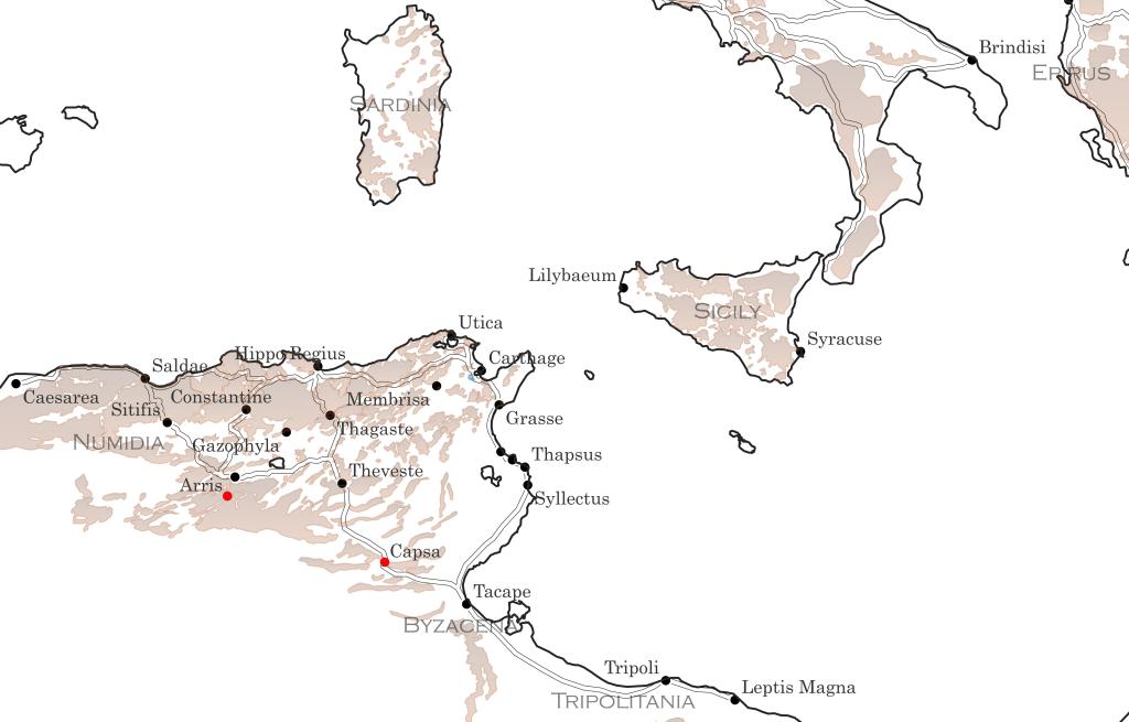 Moving east, the first section of Africa proper that we encounter is Numidia, centered on Hippo Regius, in modern Algeria. The land was fertile and pretty heavily settled by Vandal landholders, especially the eastern half. The center of the kingdom, Africa Proconsularis, contained mighty Carthage with its great port. It maps more or less onto the northern half of Tunisia, with a slice of Algeria to boot. This was the wealthiest chunk of the kingdom, and the area where Vandal settlement was most concentrated. Moving south, into what would become southern Tunisia, we find the region of Byzacena. Vandal settlement thins out considerably as we move south, with only a few garrisons stationed in these outlying areas. Lastly, along the coast of modern Libya, the strip of land called Tripolitania, centered on, guess where, Tripoli, hardly contains any Vandals at all, and is bound to Carthage mainly by fear of interference than actual administrative control.
