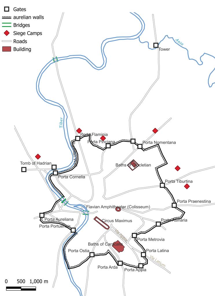 The Aurelian walls which had protected Rome since the 270s enclose an area of 13.7 square km, 5.3 square miles, behind 12 miles of brick and Roman concrete. In the year 500 they were pierced by 23 gates of varying size and importance, and augmented by 383 towers.