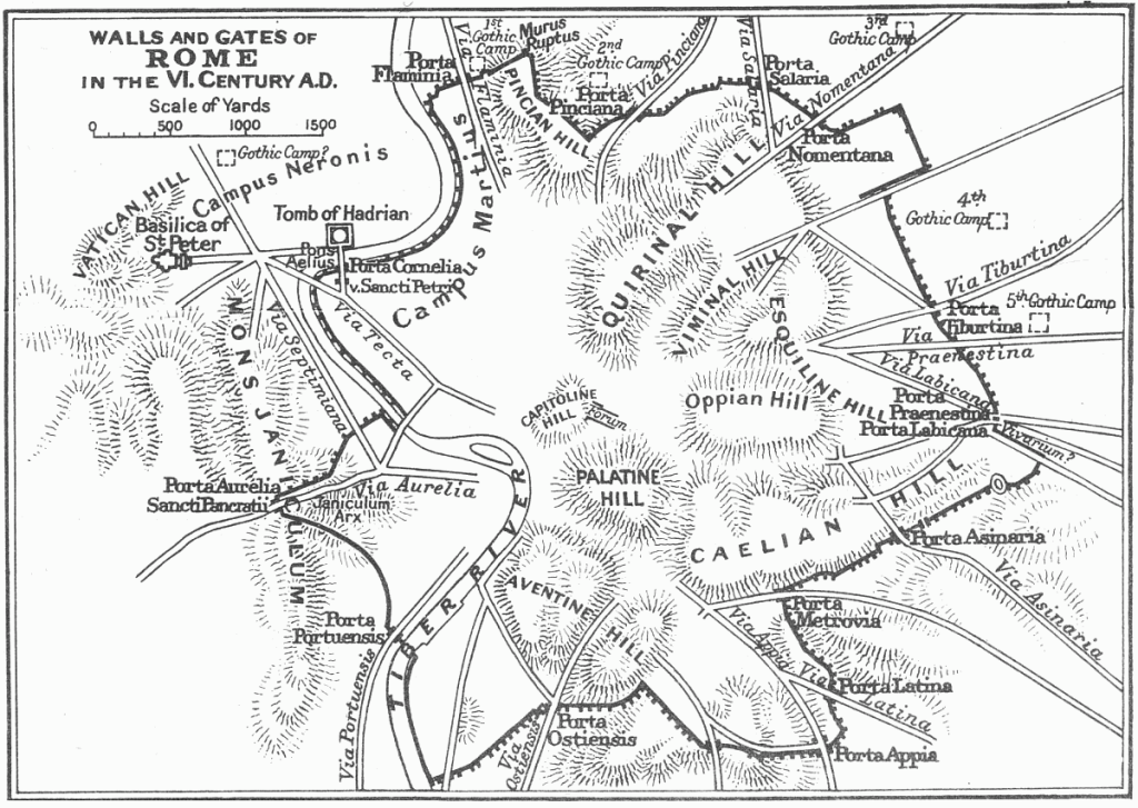 The Goths set up six camps on the east side of the Tiber, opposite the primary north-facing gates, and one more on the west, between the Vatican hill and the river. In spite of his massive advantage in numbers, Vitiges did not have enough men to completely surround the city. (More evidence that Procopius’ figure of 100 thousand is an exaggeration.) The south-facing gates remained unguarded. Both sides settled in for a proper siege. Belisarius ordered most of the minor gates bricked up, as Vitiges’ men set about breaking all the fourteen aqueducts that fed the city. Mindful of the events that had delivered Naples to him, Belisarius had the aqueducts inside the walls sealed with sturdy masonry, to prevent anyone entering that way.
