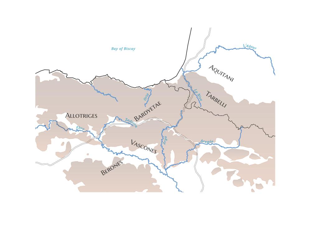 Language may also have had a unifying influence among the people of the hills. In this period we also see the final disappearance of different tribal names. No more references to Vardulli, or Allotriges, they are all Vascones. Whether they accepted such an externally imposed identity we can’t know, but they probably saw themselves as different from the lowlanders, and that may have become a more important distinction than that between the various mountain tribes, who at least shared a common language. A similar process occurred in other frontier areas of the old empire. In Scotland, for instance, an extensive list of tribes that lived north of the wall was reduced to just two after the Roman collapse.
