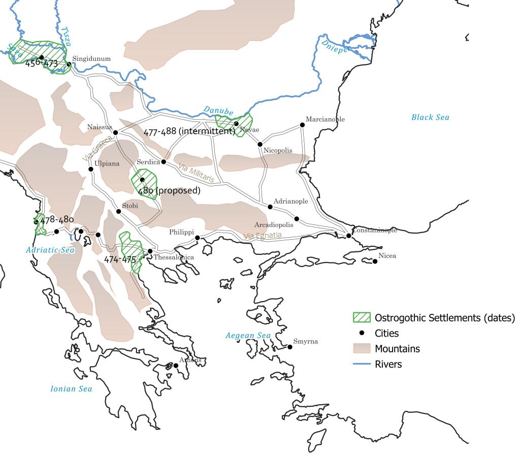 Areas settled by the Ostrogoths between 456 and 488.