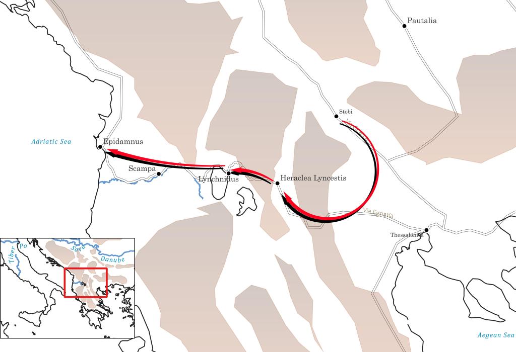 Theodoric’s road to Epidamnus, 479. Stobi and Heraclea were burned. Scampa was abandoned at the time, and was bypassed.